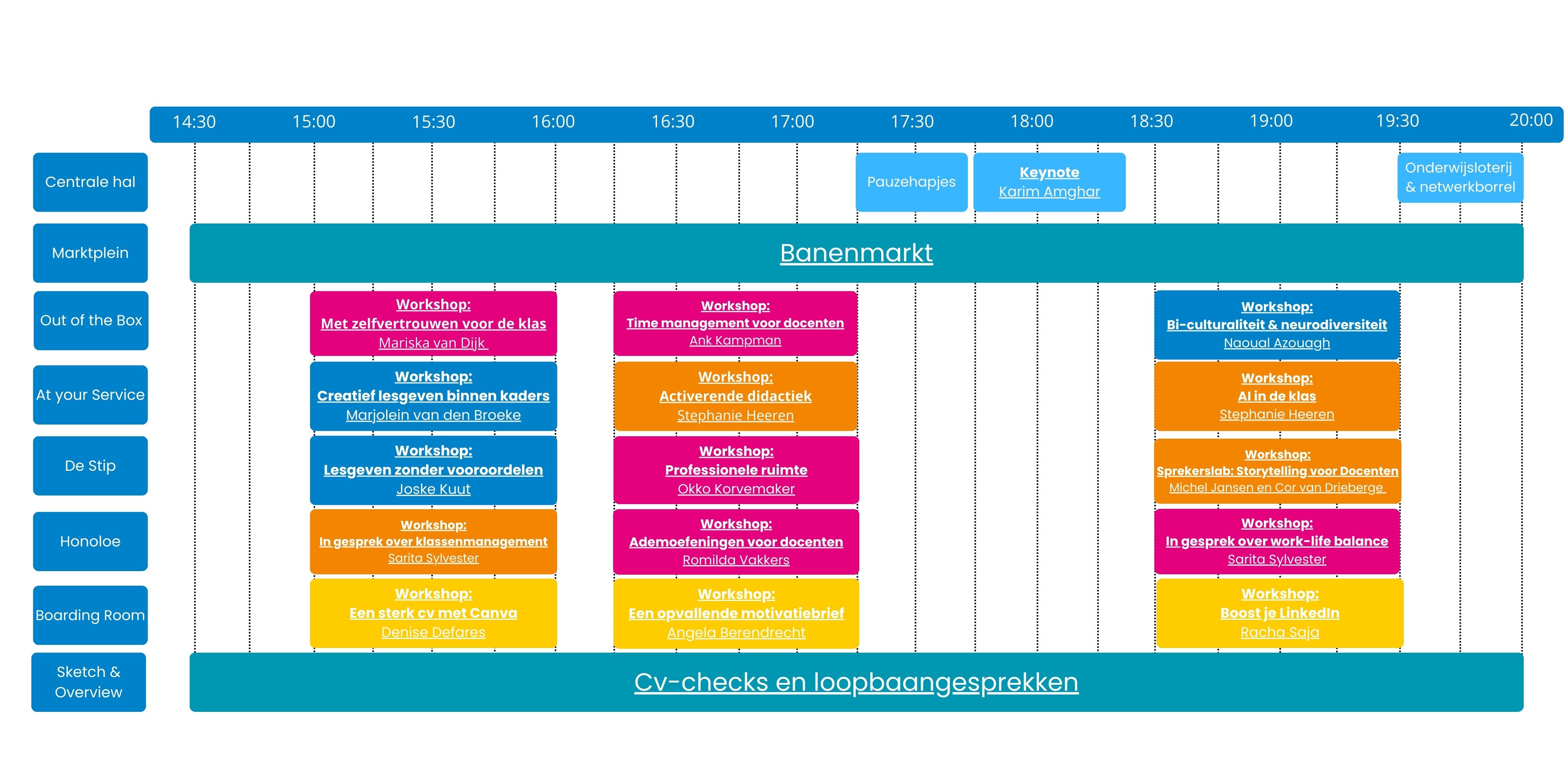 Bekijk hieronder het voorlopige programma van de Onderwijs InspiratieDag. Klik op het rooster om de interactieve versie te openen en meer details te ontdekken over de verschillende onderdelen. Het programma wordt de komende tijd verder aangevuld, dus houd het regelmatig in de gaten voor de nieuwste updates.
